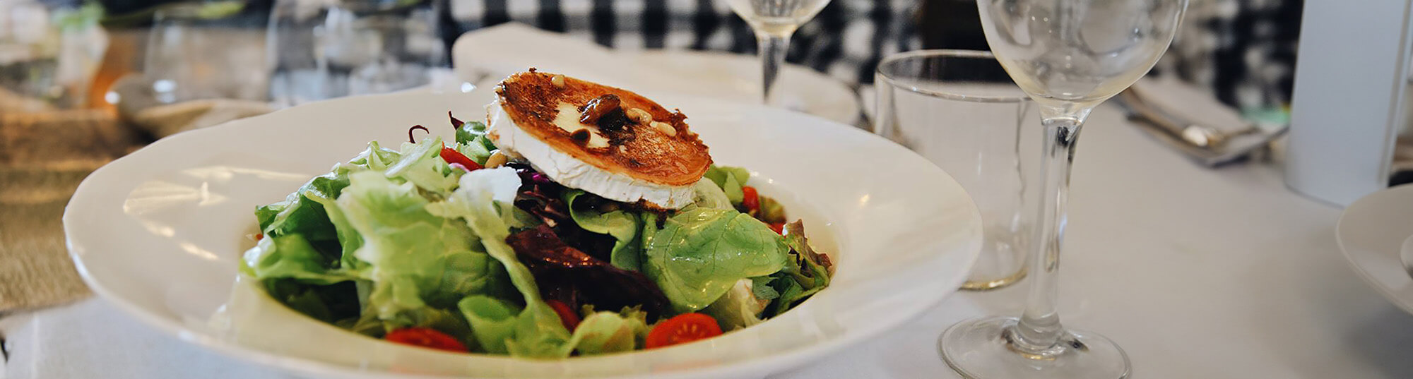 Queso de cabra, tomate cherry, piñones, pasas, ensalada variada y vinagreta de miel (3,4)