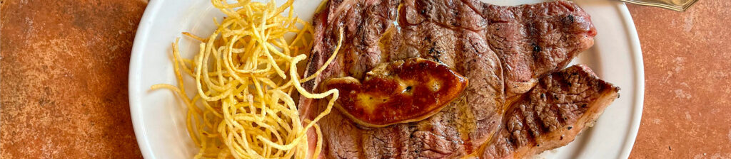 Hamburguesa de ternera con foie y patatas fritas (en el plato)